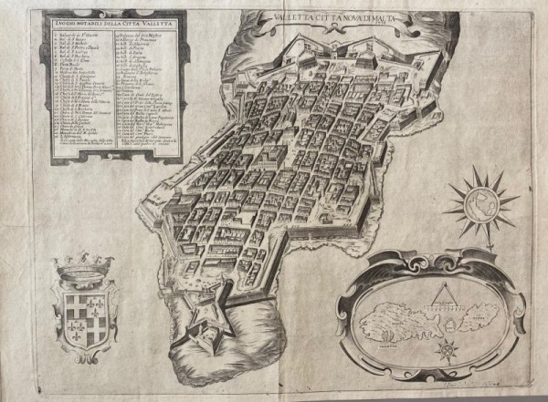 Incisione originale su matrice di rame impressa su carta forte vergellata con filigrana "del cerchio con monogramma PM" posta al centro del foglio. Titolo entro festone; a sinistra dello stesso, legenda con 56 richiami; in basso a sinistra, stemma della città di Malta; a destra entro bel cartiglio veduta delle isole di Malta, Comino e Gozo; al disopra, rosa dei venti con, all'interno, contorno geografico visto da nord, dell'Italia centro -meridionale e delle isole prospicienti. In basso a detra in prossimità della linea di inquadramento, abrasione in lastra del nome dell'incisore originario. La carta è pressochè identica a quella pubblicata nel 1595 da Francesco Villamena, questa aveva in pù una legenda nella campitura di destra, qui mancate, identico il testo della legenda e del titolo nel festone compreso, qui si aggiunge una data, 1710. Questo modello ebbe una grande diffusione grazie all'edizione di Merian del 1638, più piccola ma quasi identica a quella in esame anche se con cartiglio del titolo differente. Esemplare in buono stato di conservazione, margine di 1 cm al bordo inferiore, di 2 a quello superiore, buoni gli altri. Carta molto rara.