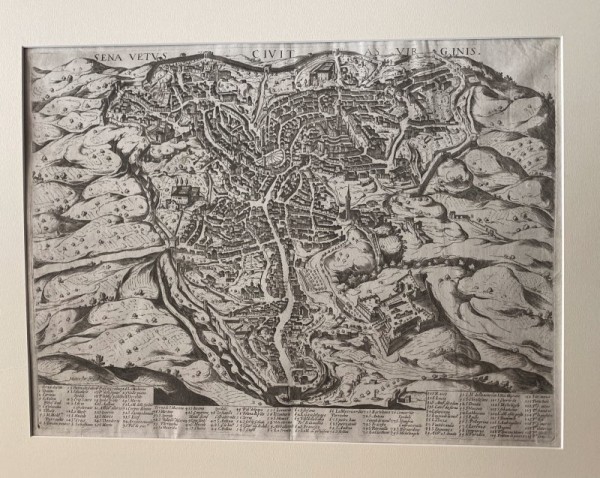 Incisione orginale eseguita all'acquaforte su rame e impressa su carta pesante e piuttosto granulata, vergellata. Tiratura della fine del secolo XVII. Titolo in lastra al centro del margine superiore; in basso a sinistra sempre in lastra, firma dell'autore "Matteo Flor. for." ; al disotto della parte figurata, legenda di 17 colonne con ben 119 richiami. Pianta propettica di Siena, derivante dal modello disegnato da Francesco Vanni e pubblicato da Peter de Jode nel 1597. La stampa in esame potrebbe essere uno degli esemplari, in tiratura tarda, pubblicati dall'editore Pietro Petrucci, che acquisì da Florimi le lastre delle sue vedute. Tavola pubblicata in una rarissima raccolta di vedute di città italiane da Matteo Florimi, importante editore senese, calabrese di origine che si stabilì in Toscana nel 1581 dove operò fino almeno al 1612, fu un editore di straordinaria importanza per la pubblicazione di piante e vedute di città rivisitate secondo le architetture nascenti e sino allora inedite. Fu allievo di Antoine de Lafrery e Claude Duchet, Esemplare in buone condizioni, inchiostratura leggermente chiara dovuta alla tiratura tarda; abilissimo risarcimento di alcune lacune a forma di mezzaluna alla parte superiore, di qualche cm ciascuna; buoni i margini laterali, piccoli quelli superiore e inferiore.