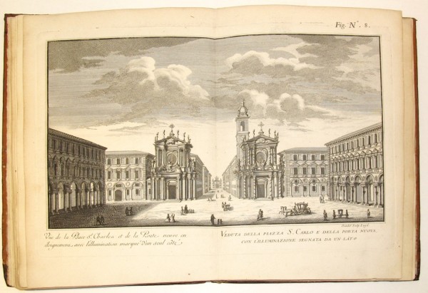 Bella legatura piemontese coeva alle armi sabaude di Carlo Emanuele III n piena pelle avana; ai piatti, due cornici di duplice filetto, con fioroni agli angoli interni nonchè agli angoli esterni della cornice più piccola; al centro del campo, placca con arma. Fastoso antiporta disegnato e inciso all'acquaforte su matrice di rame da G. C. de Prenner, raffigurante gli stemmi accollati degli sposi - XXVII - (1 bianca) - XVIII pagine numerate, compresi il frontespizio del volume, in caratteri neri e rossi, nonchè il frontespizio della relazione in lingua francese che segue a quella in italiano. Fregi tipografici silografati nel testo. Al fondo del volume, 14 tavole numerate incise all'acquaforte. L'opera, rara e considerata uno dei più bei libri sulle feste del Settecento italiano grazie al corredo illustrativo stampato su carta forte, è una relazione dei festeggiamenti allestiti a Torino in occasione delle terze nozze di Carlo Emanuele III di Savoia: il sovrano sposò infatti, nel 1737, la principessa Elisabetta Teresa di Lorena (1711-1741). La tav. 1 (mm 230 x 284) eseguita da anonimo rappresenta una veduta di Torino con, in primo piano, la carrozza della sposa che sta per entrare per la Porta di Po; la tav. 2 (mm 252 x 400) spetta a G. M. Maltese su disegno di I. Massone, e descrive via Po; la tav. 3 (mm 240 x 404) venne incisa da G. A. Belmond, e raffigura la facciata effimera del castello prospiciente via Po; la tav. 4 (mm 596 x 384) descrive il prospetto di una "Machina de Fuochi di Gioia" eretta in Piazza Castello; la tav. 5 (mm 246 x 403), sempre di Daudet, è una veduta della facciata juvarriana di Palazzo Madama; la tav. 6, di anonimo (mm 323 x 450) rappresenta il "Pavillon Royal" (allestito per l'ostensione della Sindone); la tav. 7 (mm 254 x 389) di anonimo è una veduta della facciata del Palazzo Reale, mentre la tav. 8 (mm 251 x 400) di Daudet rappresenta le due chiese di piazza San Carlo; le tavv. 9 (mm 228 x 382) e 10 (mm 382 x 236) sono state incise da G. C. de Prenner, su disegno di I. Massone: la nona è una veduta della piazza prospiciente il Palazzo di Città, la decima rappresenta la facciata del Corpus Domini; la tav. 11 (mm 297 x 398) incisa da G. Bianco, su disegno di G. M. Piovano e su invenzione di B. Vittone, descrive una delle strutture effimere agli angoli del Ghetto ebraico; la tav. 12 (mm 250 x 462) di A. Herisset, rappresenta la solenne ostensione della Sindone dal "Pavillon Royal"; la tav. 13 (mm 243 x 390) di G. A. Belmond, su disegno di I. Agliaudi, descrive l'illuminazione della Vigna (o Villa) della Regina; l'ultima tavola (mm 238 x 394) sempre di Belmond, su invenzione di B. G. Bernardi e su disegno di G. B. Borra, riproduce l'illuminazione allestita nei giardini della Venaria Reale. Esemplare in buono stato conservativo; lievi abrasioni alla legatura, che presenta delle integrazioni al dorso e agli angoli, e in luogo delle palmette in oro agli angoli dell'inquadratura centrale dello stemma; interno fresco, salvo lieve, quanto usuale, ingiallimento ad alcune carte.