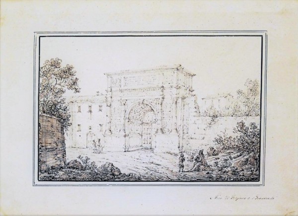 Disegno originale su carta eseguito a penna e inchiostro grigio e bruno, entro bordura di triplice filetto a inchiostro bruno; sotto la linea marginale, a destra, titolo manoscritto con grafia coeva. L'opera è un significativo esempio della produzione grafica di A. Senape, un pittore romano attivo nell'Italia meridionale durante la prima metà del secolo XIX , che spesso si ispirò al Golfo di Napoli e alla Costiera Amalfitana per realizzare - forse su commissione - degli album di vedute: egli stesso, non a caso, amò definirsi "disegnatore di paesi con la penna". In questa come in altre simili raffigurazioni, il maestro si mostra legato a un paesaggismo di tono idilliaco e pittoresco, ponendosi accanto ai migliori autori di gouaches partenopee. Nel foglio in esame, A. Senape utilizza - al fine di rendere il digradare dei piani prospettici - due inchiostri: con quello grigio, e con tratti assai delicati, descrive l'arco beneventano di Trajano; con tratti più decisi e inchiostrati di colore bruno, invece, delinea la via in primo piano, lungo la quale si osservano, a sinsitra un muro di contenimento di un giardino ed elementi lapidei in terra; a destra, un gruppo di personaggi e verzure. Esemplare in eccellente stato conservativo.