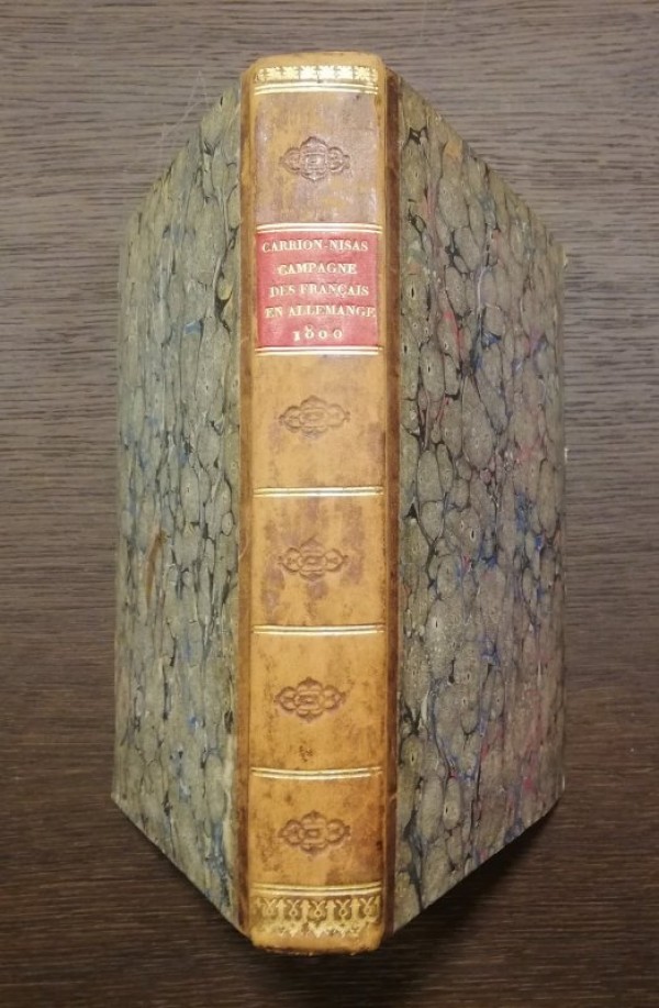 Legatura originale in mezza pelle e carta maculata; al dorso, fregi e titolo in oro su tassello rosso, tagli spruzzati di marrone. Occhiello, frontespizio, 433 pagine numerate, 2 pagine non numerate per Table des Matières e Errata, 8 tavole fuori testo, litografate con interventi coevi all'acquerello e più volte ripiegate. Opera monografica contenente una dettagliata relazione sulla campagna militare francese in Germania del 1800, corredata da molti documenti. Le accurate tavole fuori testo sono eseguite in litografia da Engelmann. L'opera si divide in due parti: la prima, sulla campagna d'estate, la seconda, sulla campagna d'inverno. Esemplare in ottime condizioni, qualche lieve fioritura a poche carte.