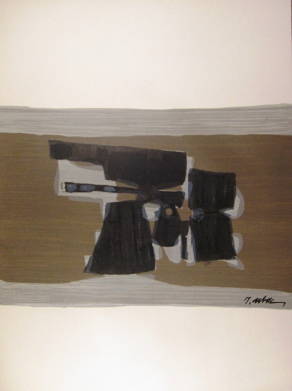 Litografia originale impressa a più colori, firma in lastra all'angolo inferiore destro. Il foglio in esame è stato ideato ed eseguito da Ubac, fotografo , pittore , incisore e scultore belga, nel 1930 si trasferisce a Parigi dove si trova a stretto contatto con i surrealisti frequentò Camille Bryen , Otto Freundlich e André Breton. Ha viaggiato molto in tutta Europa, sull'isola di Hvar, esegue "assemblaggi delle pietre trovate" che fotografa. Nel 1934 in collaborazione con Camille Bryen ha pubblicato , sotto il nome di Raoul Michelet, una raccolta di poesie e fotografie. Al Salone Internazionale del Surrealismo in La Louviere , in Belgio, espone alla prima mostra surrealista organizzata dal gruppo Out . Nel 1940 Ubac ha fondato con Rene Magritte la rivista " L' invention collective" che conoscerà solo due numeri. Tra i partecipanti figurano tra gli altri Andre Breton , Achille Chavee , Fernand Dumont , Marcel Lefrancq. Nel 1939 comincia a disegnare a penna "gli oggetti più semplici", bicchieri e bottiglie , frutta e pane, coltelli o forbici su un tavolo . Ubac ha illustrato con i suoi disegni, incisioni e litografie trenta libri e ha scritto la copertina della rivista argilla pubblicata da Maeght nel 1973 al 1981. Opere di Ubac sono presentati in numerosi musei di Francia e in Europa Tavola fuori testo per "Derrière le Miroir (DLM) No. 144-145-146" - " Hommage a George Braque ", rivista stampata dal 1946-1982, pubblicata da Aimé Maeght, mercante d'arte francese, collezionista ed editore. La "Galerie Maeght", aperta a Parigi nel 1945, ospitò lavori di illustri artisti tra cui Bonnard, Matisse, Braque, Léger, Steinberg, Chagall, Bram, Van de Velde, Miró, Kandinsky, Giacometti, Ubac, Bazaine, Calder , Derain, Chillida, Tàpies e molti altri. La pubblicazione di DLM lanciò la carriera di Maeght come uno dei più prolifici e prestigiosi editori francesi. La rivista, concepita come una squisita opera d'arte comprendeva numerose litografie originali degli artisti sopra menzionati. Poeti e letterati quali Aragon, Beckett, Char, Leymarie, Eluard, Prévert, Queneau, Reverdy, Sartre e altri contribuirono ad impreziosire il lavoro con testi inediti. Questo omaggio a Georges Braque, pubblicato nell'82-esimo anniversario della sua nascita, il primo dopo la sua morte sopravvenuta il 31 Agosto 1963, associa ai messaggi dei poeti, degli scrittori e degli artisti amici del pittore, la testimonianza di tutta una equipe di collaboratori che durante un periodo di vent'anni, assieme a Marguerite e Aimée Maeght, hanno amato l'uomo, ammirato e servito la sua opera ed hanno, a titolo diverso, collaborato a questo numero di Derrière Le Miroir a scopo di giustificare quello che un giorno ha detto Georges Braque: "La Galerie Maeght, per me, è amicizia"". Esemplare in buono stato conservativo, al verso testo di J. Leymarie dedicato a Braque.