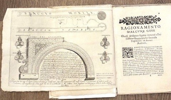 Legatura cartonata coeva; al dorso, autore e titolo manoscritti e etichetta con numeri di posizionamento. 4 pp. nn. per frontespizio figurato e dedicatoria; 1 tavola a doppia pagina incisa al verso e raffigurante lo strumento in esame; 9-100 pagine numerate con all'interno 25 illustrazioni incise in rame, numerate I-XXIV. Prima edizione nel 1598. "La squadra mobile o zoppa realizzata in ottone dall’ingegnere e agrimensore veneziano Ottavio Fabri, rappresentava una versione perfezionata del grafometro messo a punto, sul finire del XVI secolo dal francese Philippe Danfrie. Lo strumento consentiva di misurare e riportare sul disegno con grande facilità gli angoli ottusi. Inoltre permetteva con l’ausilio del riportatore costituito da una squadra con un braccio mobile e da un quadrante di fissare graficamente i punti di intersezione e calcolare le distanze con il calcolo trigonometrico. Tali caratteristiche agevolavano non poco il lavoro dei periti agrimensori e degli ingegneri. Strumenti del genere si diffusero ampiamente nel corso del XVII secolo quando le esigenze di misurazione esatta e speditiva del territorio degli agrimensori e degli ingegneri civili e militari aumentarono notevolmente”. Esemplare in buone condizioni conservative.