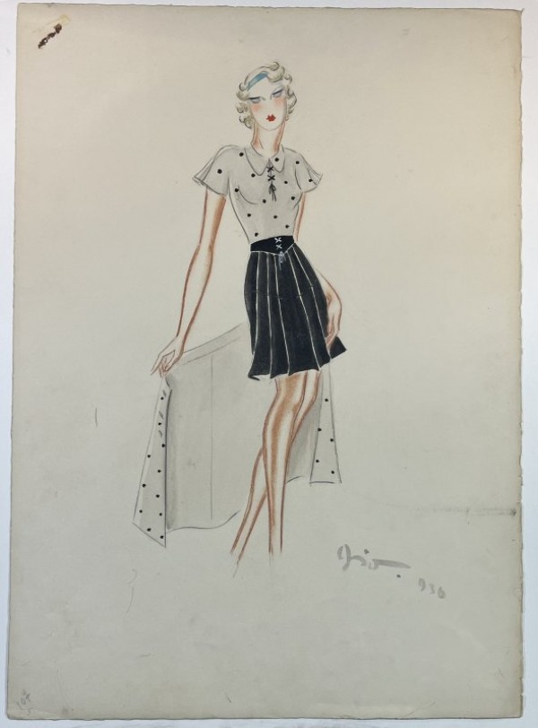 Original watercolor on cardboard representing fashion model, author's signature and date in pencil at the bottom right. The work is up to help John, an American mother Italian dress designer, active mainly in the fashion scene in Turin in the first half of the twentieth century. Its tables are made with mixed media, pencil, watercolor and tempera, characterized by an extremely elegant and sinuous lines that makes it a very 'vintage costume and fashion. Exemplary conservative in good condition.