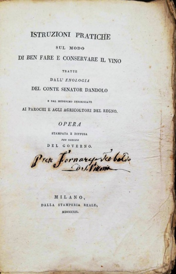 ISTRUZIONI PRATICHE SUL MODO DI FARE E CONSERVARE IL VINO TRATTE DALL'ENOLOGIA DEL CONTE SENATOR DANDOLO E DAL MEDESIMO INDIRIZZATE AI PAROCHI E AGLI AGRICOLTORI DEL REGNO. OPERA STAMPATA E DIFFUSA PER ORDINE DEL GOVERNO.