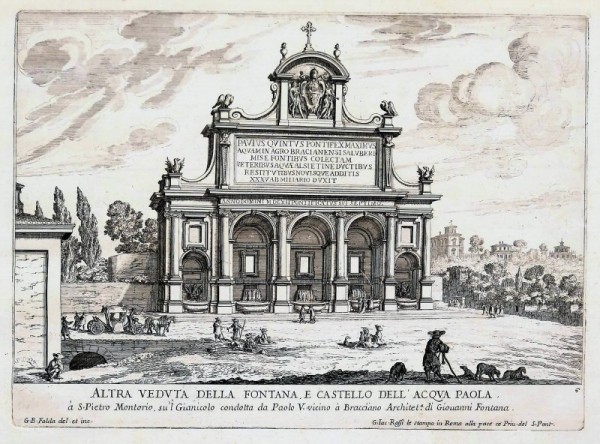 Incisione originale eseguita all'acquaforte su matrice di rame, senza testo al verso. In lastra, sotto la parte figurata, titolo, indicazione dell'autore, dello stampatore e numero di tavola. L'opera, in edizione originale, è tratta da una celebre raccolta vedutistica sulle fontane di Roma e dintorni. La silloge venne edita in tre parti, per i tipi di Giovan Giacomo De Rossi: la prima parte uscì nel 1675 circa, la seconda venne impressa prima del 1687 e la terza (in buona parte incisa da Giovanni Francesco Venturini) fu stampata prima del 1689. Autore delle invenzioni e della esecuzione incisoria è G. B. Falda, un artista valsesiano che divenne celebre per le sue opere topografiche e vedutistiche sulla Roma barocca. Falda restituisce un'immagine urbana di grande piacevolezza scenografica, caratterizzata dal senso della meraviglia. Le fontane rappresentate sono  perlopiù opere di architettura tardorinascimentale e barocca; i luoghi, di notevole interesse anche come testimonianza storica sulla Roma dell'epoca, sono animati da figure in costume seicentesco. Esemplare in ottimo stato conservativo, a pieni margini.