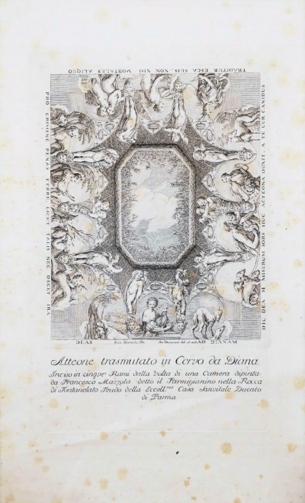 Incisione originale a bulino su matrice di rame all'acquaforte, impressa su doppia lastra, la superiore racchiude la parte figurata e quella inferiore la descrizione della stampa . La trasposizione su lastra, eseguita con abile e fine tratteggio, spetta a Bresciani, artista italiano attivo alla fine del XVIII secolo ed inizio del XIX. L'opera è ispirata ad un affresco del Parmigianino. Tavola raffigurante scena mitologica tratta da "suite" di cinque stampe sulla favola di Atteone a compendio di uno studio fatto dal Padre Ireneo Affò sulla vita del Parmigianino. Atteone nipote di Apollo, venne allevato dal centauro Chirone, che gli insegnò l'arte della caccia; Diana, scontenta per essere stata scorta da Atteone nuda mentre si bagnava ad una fonte, lo trasformò in cervo. Esemplare in buone condizioni conservative.