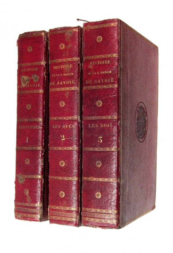 Legature originali in carta zigrinata rossa con ai piatti bordura in oro e, al centro di quelli anteriori, stemma dei Barel di Sant'Albano impresso in nero; ai dorsi, titolo, numero di tomo e indicazione di argomento (Les Comtés, Les Duc e Les Rois), fregi e filetti, il tutto in oro. Al contropiatto anteriore del I volume dedica manoscritta "L'Auteur à Madamoiselle Nina Filli, de S.t Georges, en Canavais". I volume: frontespizio, 463 pagine numerate, bianco il verso dell'ultima, 1 carta di permissione, 1 carta di errata; 42 tavole fuori testo litografate e raffiguranti i vari re e regine da Beroldo in avanti fino ad Amedeo VII. II volume 590 pagine numerate, compreso il frontespizio, 1 carta di errata; 31 tavole fuori testo litografate raffiguranti sempre i rami dinastici di Casa Savoia da Amedeo VIII a Carlo Emanuele II. III volume : 668 pagine numerate, compreso il frontespizio, 1 carta ripiegata, 1 carta di errata; 14 tavole fuori testo, di cui due all'antiporta, litografate e raffiguranti i Savoia da Vittorio Amedeo III a Carlo Felice. Importante opera, rara a trovarsi completa di tutte le tavole fuori testo, dedicata alla storia di Casa Savoia, del ramo regnante, di quello cadetto e di quello dei Carignano. I volumi sono corredati da numerose note a stampa ai margini, e, soprattutto, sono impreziositi dalle tavole, in buona parte da disegno di Francesco Gonin che raffigurano i regnanti in abbigliamento dell'epoca. Esemplare in ottime condizioni, lievi fioriture ad alcune carte, in "barbe".
