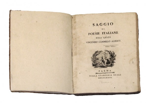 Legatura originale in cartone spruzzato di rosso; al dorso, rinforzo di carta marmorizzata settecentesca apposto a ricoprire le mancanze, evidenti segni di consunzione, traforo di tarli al piatto anteriore, scoloriture. 8 pagine non numerate, compreso frontespizio con elegante vignetta incisa (al verso ex-libris incollato di Guido Armanu), alla settima pagina altra elegante vignetta incisa e firmata Oveline?, 68 pagine numerate, di cui l'ultima carta con numerazione errata per gli indici. Brooks "Charmante impression très rare- Geering". Esemplare da studio, numerosi piccoli forellini di tarlo o minuscole traforature degli stessi, lieve ingiallimento alla parte interna praticamente a tutte le carte.