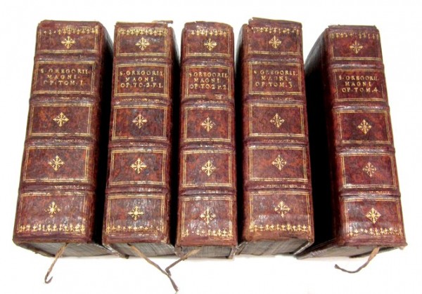 Legatura sei-settecentesca in piena pelle marmorizzata color avana; ai piatti, riquadro di duplice filetto; dorso a 4 nervi rilevati, evidenziati da fregi a rotella, con autore e numero di tomo in testa, nonch� con fiorone a losanga alle altre caselle, il tutto impresso in oro; tagli marmorizzati. Al recto del foglio di guardia del tomo I, nota di possesso "Di Monsignor Fontana Arcivescovo d'Oristano", vergata a penna con grafia antica. (4) - 255 - (1 bianca) - 600 - (382); 1040; (2) - da 1041 a 1861 - (3); 944; (2) - 1035 - (1) pagine numerate, compreso il frontespizio di ciascun tomo, recante a silografia l'arma araldica di papa Paolo V Borghese tra i Santi Pietro e Paolo. Testo in lingua latina, con richiami a margine recanti i riferimenti scritturali; capilettera silografati, in buona perte decorati a racemi, alcuni abitati. Al fondo della II parte del tomo II, nonch� al fondo del tomo IV, dati di registro e dati tipografici con indicazione, rispettivamente dell'anno 1608 e 1612. L'opera , indicata al frontespizio come "seconda edizione romana", comprende le opere di san Gregorio I papa detto il Magno, dottore della Chiesa. L'edizione � divisa in 4 tomi, ma il tomo II � articolato in 2 volumi, per un totale di 5 volumi. Il tomo I � introdotto da una lunga Vita dell'autore composta "a Iohanne, Diacono Romano" ed � concluso da un vasti indici tematici e dei riferimenti scritturali. Fra le opere del grande pontefice comprese nei tomi, sono particolarmente note i Moralia in Iob, commenti sul libro di Giobbe, nonch� le Omelie, le Lettere e i Dialoghi, dei quali celebre � quello contenente l'agiografia di san Benedetto da Norcia. Esemplare in buono stato conservativo; leggera ossidazione ad alcune carte.