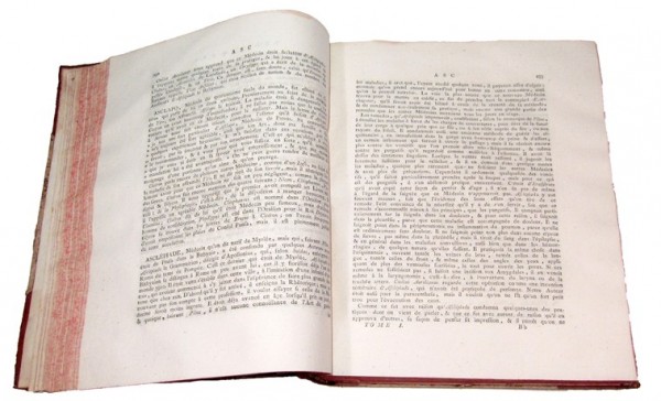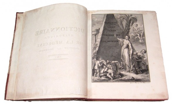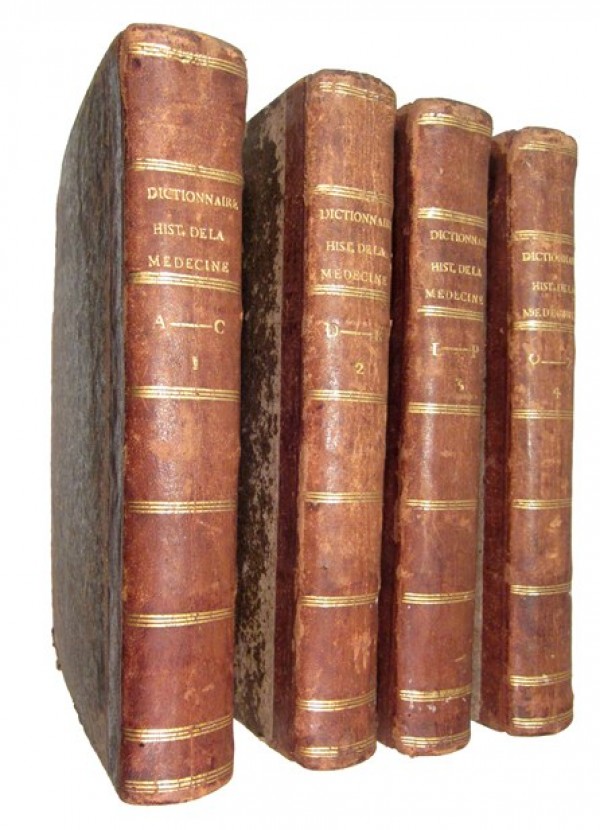 Legatura coeva in mezza pelle color avana e carta beige maculata, con punte; dorso liscio decorato con triplici filetti trasversali, recante titolo, lettere iniziali delle voci comprese nel volume, nonché numero di tomo; tagli rossi. (6) - VII - (1) - XII - 745 - (3); (4) - 649 - (1); (4) - 648; 626 - (2) pagine numerate, compresi in ciascun tomo l'occhietto e il frontespizio con marca tipografica silografata, nonché il bell'antiporta allegorico inciso all'acquaforte su matrice di rame, collocato nel volume I. Testo in lingua francese; testatina incisa all'acquaforte con arma araldica del dedicatario, in apertura della lettera di dedica; altre testatine e fregi tipografici a silografia. L'opera è la seconda pregevole edizione di un importante dizionario alfabetico di storia della medicina, uscito in edizione originale nel 1756, anche se il catalogo della libreria Morton riporta per errore la data 1775 per l'edizione originale. Il Dictionnaire è considerato, sempre nel catalogo della biblioteca Morton, come la prima raccolta esaustiva di biografie mediche. Il frontespizio dell'opera segnala che nei quattro tomi si trovano notizie utili per la storia della medicina e anche, in particolare, dell'anatomia, della botanica, della chirurgia e delle chimica in tutte le nazioni. Esemplare in buono stato conservativo; superficiale usura alle legature; interno marginoso, dalle lievi usuali tracce d'ossidazione.