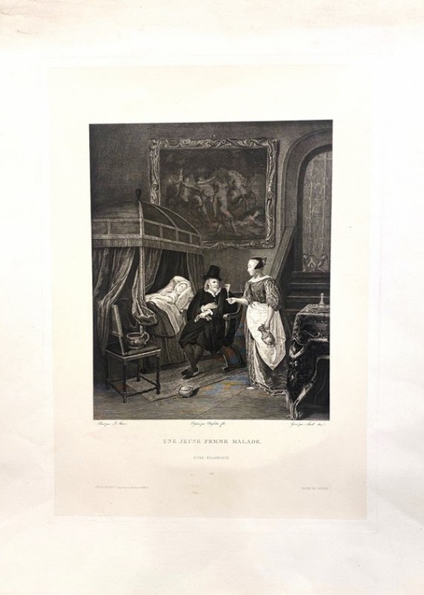 Incisione originale eseguita su matrice di acciaio, impressa su "papier du chine" e su cartoncino. La bella stampa raffigura la visita a una malata di un medico fiammingo di epoca seicentesca. Il medico è ripreso nell'atto di prendere un calice da un'inserviente e servirlo alla giovane malata giacente nel letto. Tiratura eseguita per il museo del Louvre nella seconda metà del XIX secolo con la lastra orginale di qualche decennio prima. Esemplare in buono stato conservativo.