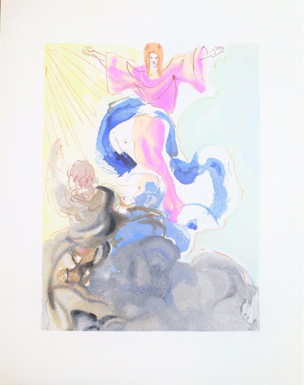 Stampa originale eseguita a xilografia impressa a più colori. L’edizione pubblicata in sei volumi della Divina Commedia con all'interno cento illustrazioni di Salvador Dalì fu stampata in 3044 esemplari di cui 44 esemplari sotto la direzione di Giovanni Mardersteig, 3000 impressi dalla Stamperia Valdonega su carta a mano dei fratelli Magnani di Pescia, di cui 100 con doppia serie di stampe e 2900 come quella da cui proviene l'esemplare in esame. Le tavole sono state eseguite a Parigi sotto la direzione del Maestro Raymond Jacquet, su carta Rives. La tavola è tratta dalla più importante opera illustrativa mai realizzata dal grande maestro spagnolo. 100 tavole riferite alle tre cantiche, Inferno, Purgatorio e Paradiso. "Ho voluto che le mie illustrazioni per Dante fossero come delle lievi impronte di umidità su un formaggio divino. Di qui, il loro aspetto variopinto d'ali di farfalla". Parole di Salvador Dalí a commento delle sue xilografie dedicate a “La Divina Commedia". Si tratta di 33 trittici (e un'ultima tavola sull'Inferno) ognuno dei quali è composto di tre tavole che raccontano il Paradiso, il Purgatorio e l'Inferno danteschi. In tutto ci sono voluti più di 5 anni di lavoro per incidere 3500 legni su cui sono stati impressi progressivamente i 35 colori di ogni singola tavola. L'opera d’incisione delle lastre in legno che riproducono le tavole è stata realizzata dal maestro Raymond Jacquet sotto la diretta supervisione di Salvador Dalí che le ha firmate, numerate e pubblicate in Francia per Les Heures Claires. Le 100 tavole da cui le xilografie sono tratte, hanno visto la nascita agli albori del periodo mistico di Dalí. Basti pensare che l'artista spagnolo ha impiegato ben dieci anni per completarle, dal 1950 al 1959, presentandole al pubblico nel 1960 al Palais Gallièra di Parigi. Le tavole furono prevalentemente dipinte ad acquerello con interventi a penna per interpretare e reinventare ciò che i versi della “Divina Commedia” suscitano nel visionario immaginario di Dalí. Ne scaturiscono forme e colori ora grotteschi, ora dissacranti, ironici, drammatici, sensuali, estatici, allegorici e inaspettatamente leggiadri e sublimi. L'esemplare si presenta in buone condizioni conservative.