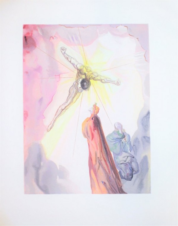 Stampa originale eseguita a xilografia impressa a più colori. L’edizione pubblicata in sei volumi della Divina Commedia con all'interno cento illustrazioni di Salvador Dalì fu stampata in 3044 esemplari di cui 44 esemplari sotto la direzione di Giovanni Mardersteig, 3000 impressi dalla Stamperia Valdonega su carta a mano dei fratelli Magnani di Pescia, di cui 100 con doppia serie di stampe e 2900 come quella da cui proviene l'esemplare in esame. Le tavole sono state eseguite a Parigi sotto la direzione del Maestro Raymond Jacquet, su carta Rives. La tavola è tratta dalla più importante opera illustrativa mai realizzata dal grande maestro spagnolo. 100 tavole riferite alle tre cantiche, Inferno, Purgatorio e Paradiso. "Ho voluto che le mie illustrazioni per Dante fossero come delle lievi impronte di umidità su un formaggio divino. Di qui, il loro aspetto variopinto d'ali di farfalla". Parole di Salvador Dalí a commento delle sue xilografie dedicate a “La Divina Commedia". Si tratta di 33 trittici (e un'ultima tavola sull'Inferno) ognuno dei quali è composto di tre tavole che raccontano il Paradiso, il Purgatorio e l'Inferno danteschi. In tutto ci sono voluti più di 5 anni di lavoro per incidere 3500 legni su cui sono stati impressi progressivamente i 35 colori di ogni singola tavola. L'opera d’incisione delle lastre in legno che riproducono le tavole è stata realizzata dal maestro Raymond Jacquet sotto la diretta supervisione di Salvador Dalí che le ha firmate, numerate e pubblicate in Francia per Les Heures Claires. Le 100 tavole da cui le xilografie sono tratte, hanno visto la nascita agli albori del periodo mistico di Dalí. Basti pensare che l'artista spagnolo ha impiegato ben dieci anni per completarle, dal 1950 al 1959, presentandole al pubblico nel 1960 al Palais Gallièra di Parigi. Le tavole furono prevalentemente dipinte ad acquerello con interventi a penna per interpretare e reinventare ciò che i versi della “Divina Commedia” suscitano nel visionario immaginario di Dalí. Ne scaturiscono forme e colori ora grotteschi, ora dissacranti, ironici, drammatici, sensuali, estatici, allegorici e inaspettatamente leggiadri e sublimi. L'esemplare si presenta in buone condizioni conservative.