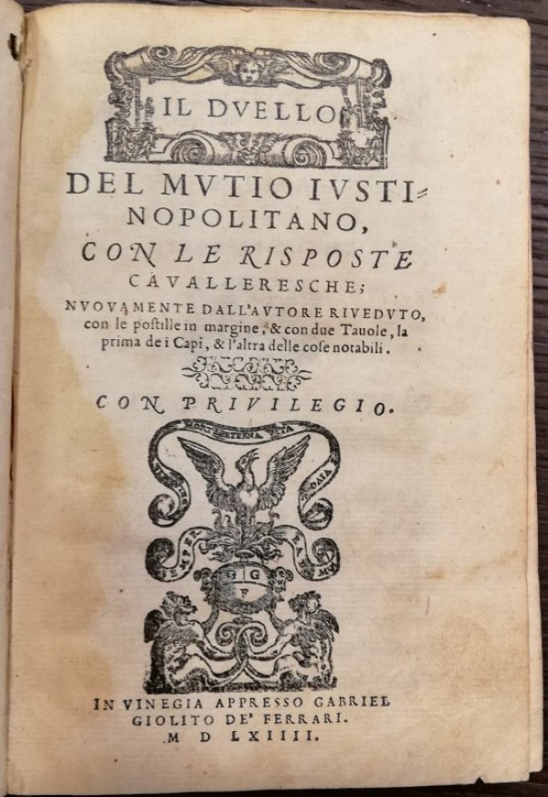 IL DUELLO DEL MUTIO IUSTINOPOLITANO, CON LE RISPOSTE CAVALLERESCHE; NUOVAMENTE DALL'AUTORE RIVEDUTO, CON LE POSTILLE IN MAR5GINER, ET CON DUE TAVOLE, LA PRIMA DE I CAPI, ET L'ALTRA DELLE COSE NOTABILI.