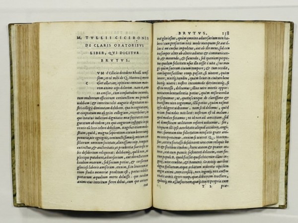 Legatura in mezza pelle e carta maculata del XVIII secolo, al dorso, autore e titolo in oro su tassello rosso, fregi in oro trasversali. 240 (i.e. 248) carte mal numerate, compreso il frontespizio con titolo e ancora aldina, antica nota manoscritta diu possesso "Franciscus Bonis". Paulus Manuzio (1512-1574), il figlio più giovane di Aldo, fu un editore molto influente e uno dei più importanti umanisti del tardo Rinascimento italiano. Questo è il secondo volume di tre, pubblicato separatamente, dell'Opera Rhetorica, a cura di Paulus Manutius con il testo basato sull'edizione del 1546 e corretto da Manuzio stesso. Marco Tullio Cicerone (106-43 aC) fu una delle figure più influenti dell'antichità classica, egli mise le sue capacità legali al servizio della politica con discorsi che divennero punti di riferimento dell'oratoria forense. Definita da Quintiliano come l'eloquenza stessa, la sua copiosa produzione in prosa occupò un posto fondamentale nei programmi di studio medievali. Cicerone fu uno statista, giurista e studioso romano, Il più grande oratore della tarda Repubblica. Il volume è una notevole raccolta delle sue opere di retorica, in cui presenta i canoni di questa complessa disciplina, la sua storia e insegna come usarla. Esemplare internamente in ottime condizioni, fresco e bene impresso, la legatura presenta la riattaccatura del piatto anteriore.