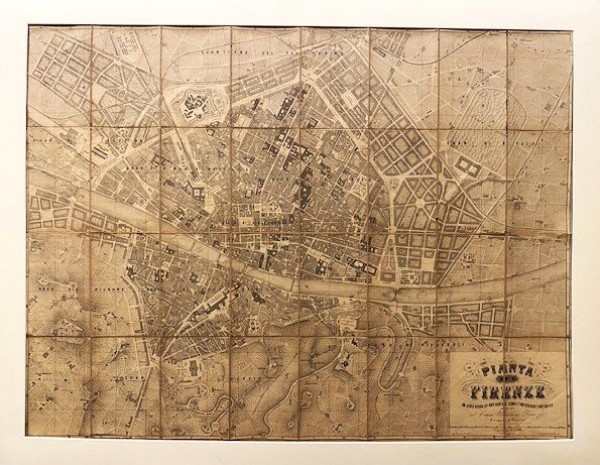 Litografia originale su carta controfondata su tela d'epoca e divisa in 32 stacchi per consentirne la piegatura. In basso a destra, ampio cartiglio con titolo e dati tipografici. La stampa raffigura un'ampia mappa di Firenze secondo il piano regolatore approvato sotto la sindacatura di Ubaldino Peruzzi, notabile politico di lungo corso, a cui la mappa è dedicata. Esemplare in discrete condizioni dalla lieve quanto uniforme ingiallitura, alcune fessure nello spazio di tela ad alcuni stacchi.