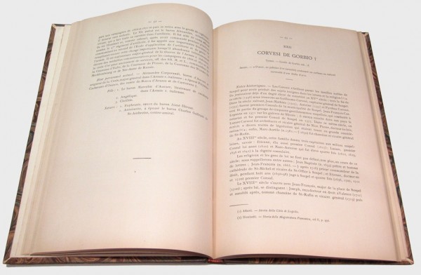 Legatura di metà '900 in mezza pelle e carta marmorizzata, titolo su tassello e fregi floreali in oro al dorso. 160 pagine numerate, compreso il frontespizio, l'errata e gli indici finali. Rara monografia araldica concernetne la descrizione storia di 60 famiglie nobili dell'antica Contea di Nizza. Bell'esemplare a pieni margini.