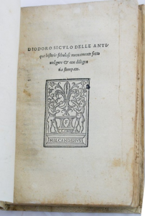 Legatura rimontata con antica pergamena da reimpiego. 119-(1) carte numerate, compreso il frontespizio con titolo e ampio giglio fiorentino come marca tipografica, ripetuta all'ultima pagina. Prima rarissima edizione della traduzione in volgare del Diodoro Siculo, venne ripubblicata poi da Giolito nel 1542 proprio rifacendosi a questa edizione. Esemplare in buone condizoni interne, fresco e ben stampato; lievi tracce di sporco e piccolissime controfondature di foretti di tarlo al frontespizio; segnalato rifacimento della legatura.
