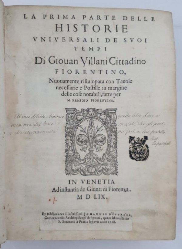 LA PRIMA PARTE DELLE HISTORIE UNIVERSALI DE SUOI TEMPI DI GIOVAN VILLANI CITTADINO FIORENTINO, Nuovamente ristampata con Tavole necessarie e Postille in margine delle cose notabili, fatte Per M. Remigio Fiorentino. Unito a: LA SECONDA PARTE DELLE HISTORIE