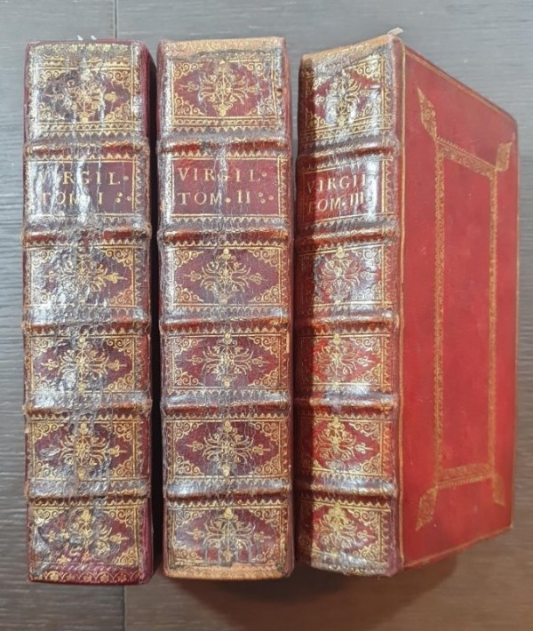 Elegante legatura coeva in pieno marocchino rosso con duplice filetto, cornice centrale con angolari fitomorfi impressi in oro ai piatti; cinque nervi rilevati al dorso con decori alle campiture e titolo in oro; tagli dorati; dentelle interne in oro e sguardie marmorizzate. AL contropiatto anteriore del I volume, ex-libris di I. Wight S.M. .(384 pagine non numerate: Dedicatio; Praefatio; P. Virgilii Maronis Vita; Index Erythraei) -704 + (2)-1124 + 982, pagine numerate; numerosi capolettera e finalini a silografia; tre frontespizi con vignette silografiche, antiporta incisa su rame e 15 belle tavole a piena pagina, sempre incise in rame da Appelmans. Al verso del primo frontespizio, grande ex-libris incollato di James Carrington Clerk. Pregevole edizione delle opere virgiliane, citata da molte bilbiografie come una delle migliori del XVII secolo. Esemplare complessivamente in buone condizioni conservative; piccoli restauri integrativi al piede e al bordo superiore dei dorsi; interno fresco e dalle tavole bene incise.
