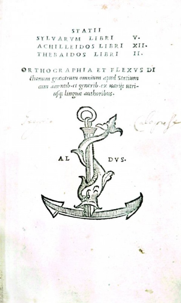 Legatura in piena pelle  testata di moro  del XX secolo in stile rinascimentale, opera dell'atelier Gozzi di Modena. Ai piatti, filetti, losanghe e angolari floreali a secco e in oro con, al piatto anteriore in basso, monogramma SV a secco; dorso a 3 nervi rilevati con filetti in oro e a secco; tagli spruzzati. 294-(2) carte  numerate, compreso il frontespizio  con titolo e ancora aldina, 2 carte bianche all'interno a divisione dei capitoli, ancora aldina silografata al verso dell'ultima carta; testo in latino e greco in carattere corsivo. Seconda edizione aldina, reimpressione della prima pubblicata nel 1502, qui  aumentata con una lettera di prefazione di Francesco Asolano al fratello Domizio e a Pasquale Marini. Esemplare in buone condizioni, lieve goretta alla parte  alta esterna di qualche pagina, poche fioriture.