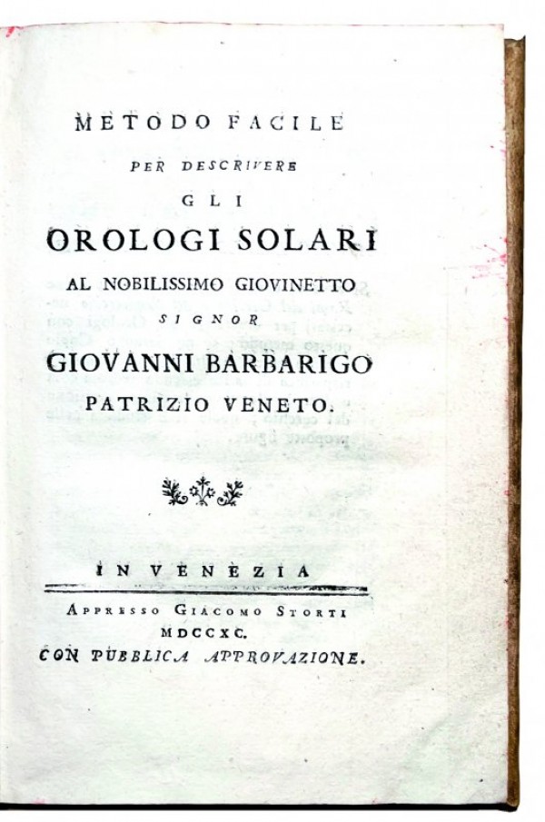 Legatura coeva in piena pergamena rigida; titolo in oro su tassello rosso al dorso; tagli spruzzati di rosso. 47-(17) pagine numerate, compreso il frontespizio. 1 tavola incisa e ripiegata all'ingresso del volume come antiporta; al fondo del volume, 5 tavole fuori testo incise e ripiegate. Prima edizione, in variante B. con 17 pagine non numerate finali in luogo di 21. Opera di carattere essenzialmente pratico sulla costruzione degli orologi solari, con l’aggiunta delle tavole gnomoniche per le ore francesi, per le ore italiane delle rifrazioni, delle altezze per le principali località venete. Esemplare in ottime condizioni conservative.
