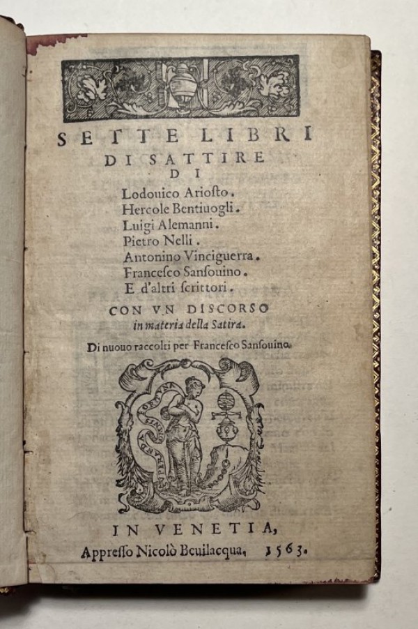 Legatura trado seicentesca in marocchino rosso, triplice cornice a filetti in oro con angolari floreali in oro ai piatti, dorso con titolo in oro e fregi floreali in oro agli scomparti; tagli dorati; sguardie marmorizzate; ex libris al contropiatto anteriore "Charles Butler" e al contropiatto posteriore con stemma "Wilmot Viscount Liburne". (8)-206-(1)-(1cb) carte numerate (errore di numerazione p. 156). Frontespizio con marca tipografica silografata; capilettera abitati e testatine silografate. Si tratta di un'antologia curata da Francesco Sansovino che raccoglie testi di diversi autori. La raccolta riscontrò un notevole successo confermando la rinascita della satira luciliana in versi e l'adozione del modello classico, proposto da Orazio e Giovenale in lingua volgare, e venne ristampata più volte fino al 1580. Jean Vauquelin de La Fresnaye, l'inventore del genere in lingua francese, fece ampio uso dei Sette libri di satire di Sansovino nelle sue Satyres Françoises (Caen, 1604-1605); Lo stesso Enrico III possedeva una copia dell'edizione stampata da Vidali nel 1573. Esemplare in discreto stato conservativo, le 7 carte dopo il frontespizio provengono, all'epoca delle legatura, da altra edizione e sono leggermente più corte al margine inferioreo; all'interno numerose pagine con lievi tracce di scolorimento o trasparenza a seguito di un probabile lavaggio sempre all'epoca della legatura.