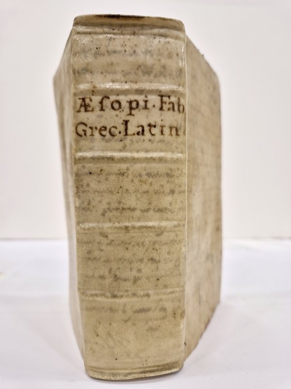 Legatura coeva in piena pergamena da riutilizzo di antico codice come da traparenza, dorso con autore e titolo manoscritto abbreviato, tagli spruzzati. 600 pagine numerate, testo in greco con traduzione a fronte in latino. Primo capolettera silografato. Le famose favole dello scrittore greco antico Esopo precedute dalla narrazione della sua vita. Esemplare in discrete condizioni con alcune lievi gore d'acqua, più evidenti all'angolo inferiore delle prime 20 pagine, altrimenti fresco e bene impresso.