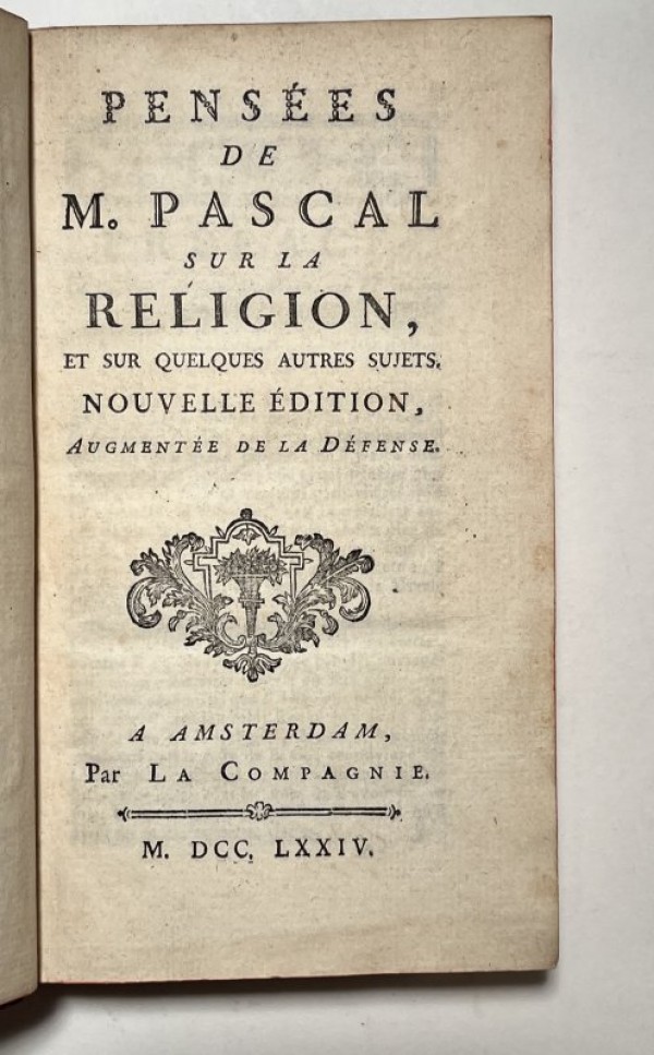 Legatura in piena pelle marrone maculata, dorso con fregi floreali in oro agli scomparti; titolo e autore su tassello; tagli rossi; sguardie marmorizzate. XXV-(9)-420-(2cb). Frontespizio con fregio tipografico silografata; testatine, finalini e alcuni capilettera silografati. Il testo in francese si apre con la Vita di M. Pascal scritto da madame Perier, sua sorella, seguono poi: i Discorsi sui pensieri; i Discorsi sulle bozze dei libri di Mosè; la Difesa dei pensieri di Pascal contro la critica di M. de Voltaire; Pensieri di M. Pascal sulla Religione e su altri argomenti. Esemplare in buono stato conservativo, lievi tracce di usura alle cerniere del dorso, altrimenti interno fresco e con buona marginatura.