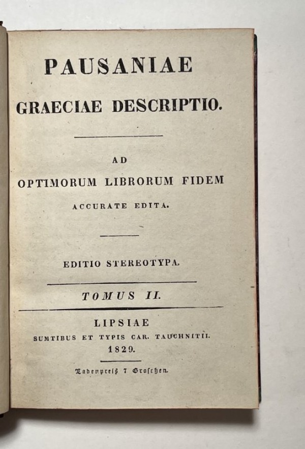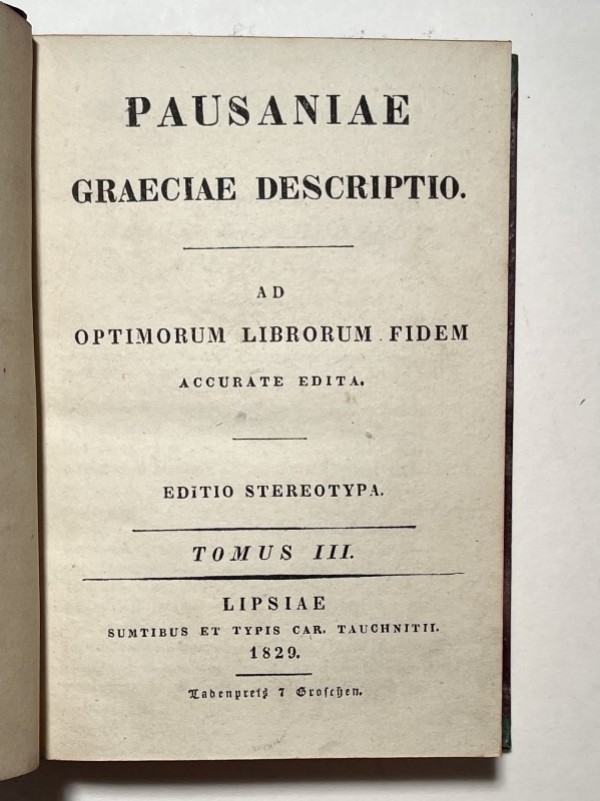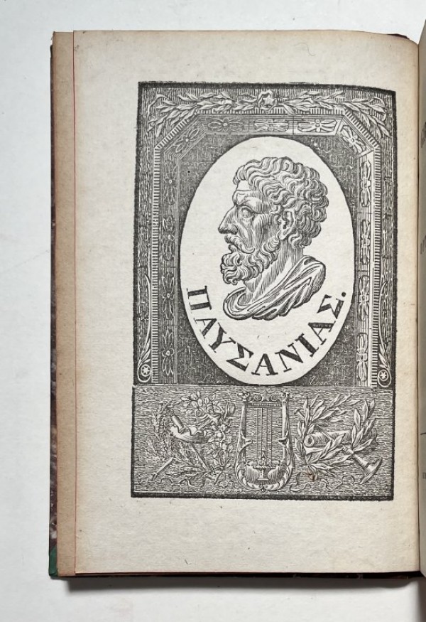 Legatura in mezza pelle avana, piatti marmorizzati, dorso a 5 nervi con decori in oro, autore e numero di tomo in oro su tassello marrone; ex libris di possesso al contropiatto con la scritta "Faire et Taire"; sguardie marmorizzate, tagli rossi . (1cb)-339-(1cb) pagine numerate; (1cb)-376-(1cb); (1cb)-372-(1cb). All'antiporta del primo volume, incisione silografica a piena pagina con ritratto dell'autore inscritto in un ovale con il nome in greco e cornice decorata con una lira e altri strumenti musicali. Testo in lingua greca. Pausania è stato un militare spartano, i suoi testi sono considerati la fonte più importante per la conoscenza della topografia e storia dell'arte greca. Esemplare in buono stato conservativo salvo alcune carte con lievi ossidazioni.