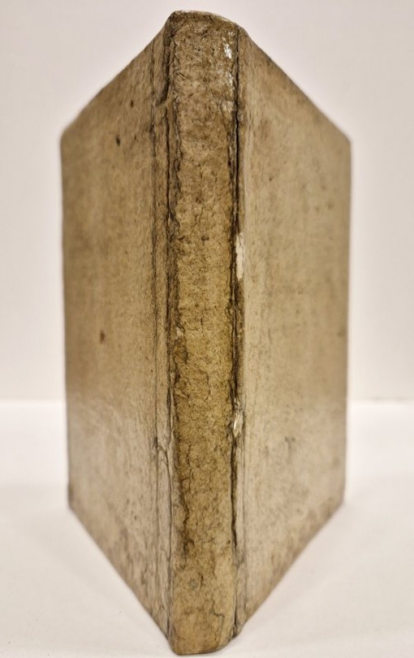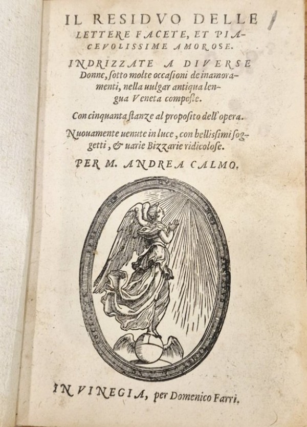 Legatura rifatta con cartonnage da reimpiego, tagli spruzzati di blu. 87- (1) carte numerate. Bella marca tipografica al frontespizio con angelo iscritto in una cornice ovale, alcuni grandi capilettera silografati e abitati, testatine e finalini silografati. Raccolta di lettere d'amore e testi ironici tipici della Commedia dell'Arte veneziana scritti da Andrea Calmo in lingua volgare. Esemplare in discreto stato conservativo, gore d'acqua all'angolo superiore esterno di praticamente tutto il volume; idem per una gora più piccola e lieve all'angolo inferiore esterno, alla carta 3 piccola lacerazione richiusa al margine superiore, ma senza perdita di testo.