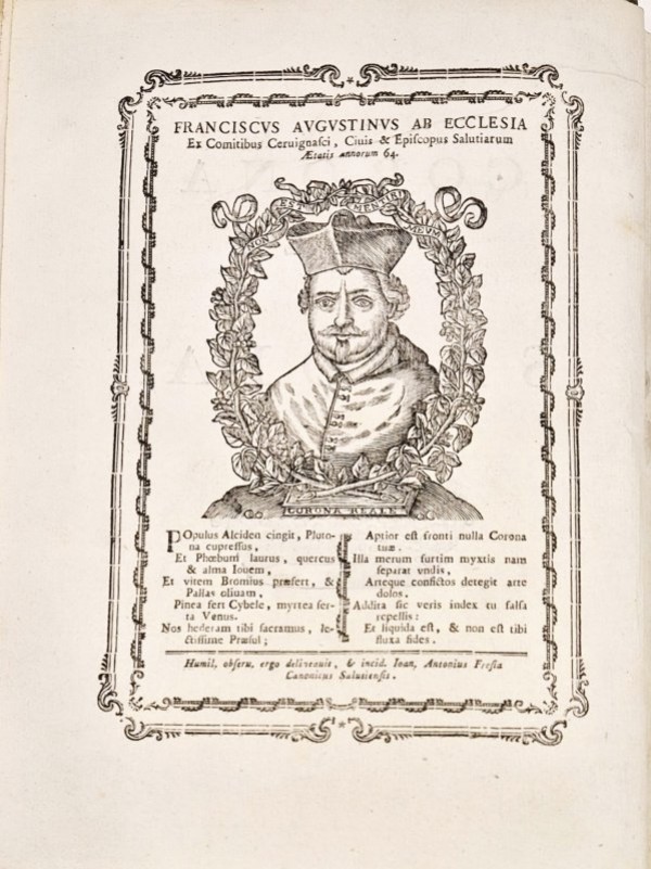 Legatura in mezza pelle verde e carta marmorizzata, dorso con filettature in oro, tagli spruzzati blu.1 Vol. XL - 285- (1) pagine numerate, all'antiporta ritratto dell'Autore silografato, entro due cornici e entro ovale con racemi e fregi floreali, frontespizio con grande stemma sabaudo nella seconda ampliazione voluta da Amedeo I, sormontato da corona reale chiusa, fregiato del collare della SS. Annunziata e sostenuto da due leoni controrampanti, in uso con Carlo Emanuele II e con Vittorio Amedeo II ; 2 Vol. XVI-323- (1) pagine numerate, frontespizio con grande stemma sabaudo. Testatine, finalini e diversi Stemmi araldici silografati nel testo. Seconda edizione di una tra le più importanti opere genealogiche e storiche sul Piemonte. Al termine di ogni volume si trovano due ampie tavole in ordine alfabetico "Delle città, borghi, castelli, chiese principali, monti, fiumi, laghi e bagni" e "Delle famiglie, huomini illustri, e popoli". Francesco Agostino Della Chiesa, vescovo di Saluzzo, intese raccogliere tutte le notizie geografiche, storiche, economiche e di costume sugli Stati governati dal principe Carlo Emanuele II (1634-1675) e le unì per formare idealmente una corona reale da deporre sul capo del suo sovrano. Descrisse tutte le provincie appartenenti a sua Altezza Reale con un breve discorso sull'origine dei titoli a quelle spettanti, e alle loro città, castelli, ville, abbazie, monasteri e chiese principali; inoltre narrò i fatti per cui ciascuna di esse divenne un possedimento sabaudo e, infine, segnalò i nomi dei personaggi illustri o nobili che in esse dimorarono. Nel primo tomo sono trattati il "Ducato di Savoia, del Chiablese, d'Osta, di Genova, del Monferrato, il Principato del Piemonte e il Marchesato di Saluzzo". Il secondo tomo descrive il "Contado di Ginevra, di Romont, di Nizza, d'Asti, di Tenda, la Baronia di Vaus, di Fossigny, la Signoria di Vercelli, il Marchesato di Ceva, la Signoria di Oneglia, del Maro, il Marchesato d'Italia, il Principato del Sacro Romano Impero e il Regno di Cipro". Esemplare fresco in eccellenti condizioni, sporadiche e lievissime arrossature a qualche carta.