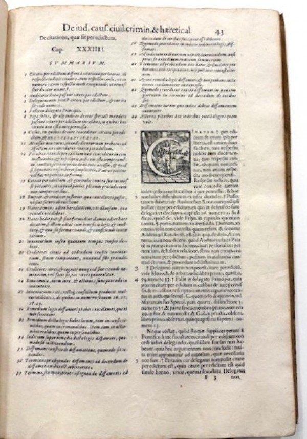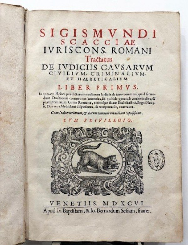 Elegante legatura coeva in piena pergamena floscia con, ai piatti, duplice filetto esterno, altro duplice filetto più interno con palmette angolari esterne ed elaborati angolari interni a motivo fitomorfo; al centro dei piatti, stemma vescovile accollato delle famiglie Colonna e Orsini; al dorso, eleganti fregi in oro e titolo manoscritto leggermente sbiadito; tagli dorati. (1 cb)- (4)-(32)-249-(2) carte numerate. Nell'esemplare in esame la carta bianca è posta prima del frontespizio e non dopo la carta d8 non numerata. Frontespizio con titolo in rosso e nero, ampia marca silografica dei Sessa, timbro della bibliotca umbra estinta "Biblioteca Giovannini" con monogramma al centro dell'ovale; altra grande marca dei Sessa ripetuta al recto della carta dopo la 249, con i dati di colophon, a cui segue la pagina di Errata; testo in latino su due colonne; all'interno, numerosi eleganti capilettera abitati e silografati. Prima edizione del primo libro dei due previsti, il secondo vide la luce 22 anni dopo, nel 1618. Un libro davvero molto raro di questo rilevante trattato giuridico di dirittto civile, criminale e sulle eresie, che riporta numerosi decreti del Sant'Uffizio dell'epoca. Scaccia si addottorò in "utroque iure" presso la Sapienza di Roma nel 1584, fu consultore dell'Inquisizione a Manta tra il 1585 e il 1588. Fu quindi giudice civile a Frascati (1589) e servì la famiglia Colonna dal 1592 al 1600, ecco il motiovo della magniifica legatura in esame con lo stemma dei Colonna e degli Orsini. Nel 1605 fu nominato podestà di Lucca. Fu altresì uditore della Rota civile a Genova (1612-1615) e giudice civile e podestà a Firenze (dove soggiornà tra il 1620 e il 1623). Inoltre, divenne celebre anche per un fondamentale trattato di diritto commerciale " De Commerciiis et Cambio", pubblicato nel 1619. Esemplare complessivamente in buone condizioni, dalla legatura particolarmente elegante, in pergamena floscia sottile, con qualche segno di ususura; sporadiche lievi fioriture, leggero alone d'umido appena percettibile al margine inferiore interno delle prime carte ed esterno da carta 250 al termine del volume.