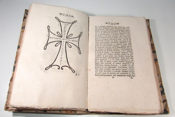 Legatura coeva in carta marmorizzata policroma. Dorso liscio con numero di collocazione manoscritto al piede. XX - 252 pagine numerate, compresi il frontespizio con bella vignetta incisa all'acquaforte (raffigurante una veduta della città oltre il corso del fiume), nonché la carta seguente, bianca, con (al verso) stemma racchiuso entro raffinato cartiglio e timbrato da corona comitale, eseguito all'acquaforte e a bulino da S. Pomarede. Fregi tipografici silografati. Un'epigrafe cruciforme a piena pagina (p. 32) e varie altre piccole silografie nel testo, riproducenti soprattutto antichi monogrammi leggibili sui monumenti ravennati. Due tavole fuori testo, eseguite all'acquaforte su matrice di rame e impresse su fogli più volte ripiegati: la prima (a fronte di p. 193) raffigura un personaggio allegorico a fianco del mausoleo di Teodorico. La seconda tavola (di maggiori dimensioni e posta al fondo del libro) è una pianta topografica di Ravenna, recante sopra la linea marginale inferiore le indicazioni degli autori: "Ios. Carolus Morigi Pub. Geom. & I. U. D. del." e "Iulius Contarini sculp. Rav. 1781"; lungo i lati sinistro, superiore e destro della mappa vi sono (rispettivamente) il titolo tra fregi, l'arma di Ravenna e un cartiglio con numerosi richiami. Il volume è la rara prima edizione di un'apprezzata guida ai monumenti della città di Ravenna, che (per bontà e attendibilità) ha meritato le lodi di Cicognara e di Lozzi. Lo stesso Schlosser Magnino cita questo testo come esempio dell'antica letteratura locale "dei Ciceroni" fiorita a Ravenna (come in altri centri italiani di nobili tradizioni). L'opera reca in apertura la lettera dedicatoria dell'autore al conte e senatore ravennate Marco Fantuzzi (la cui arma è probabilmente raffigurata nell'incisione di Pomarede). Esemplare in ottimo stato conservativo, genuino, interno fresco, sporadiche quanto lievi ossidazioni, modeste abrasioni alla legatura, in particolare al dorso; in barbe.
