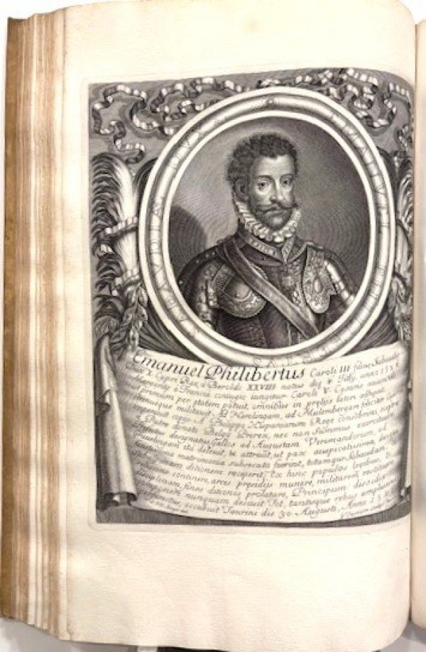 Legatura coeva in piena pergamena rigida; ai piatti, due riquadri di filetto con fregi accantonati agli angoli interni del riquadro esterno, nonchè agli angoli interni ed esterni del riquadro interno; placca mistilinea al centro del campo, il tutto impresso a secco; dorso a 7 nervi rilevati, con tassello rosso in testa recante titolo impresso in oro. Sontuoso antiporta figurato e inciso su rame da Bartolomeo Giuseppe Tasnière su invenzione di Giulio Cesare Grampin con, al centro su un piedistallo, grandi armi sabaude sormontate da corona reale, fregiate del collare della SS. Annunziata; sullo sfondo, panoplie e fronde di palma (Jul. Caesar Granpinus inv. et delin., G. Tasniere sculps. Taur. 1703); 208 pagine numerate compreso il frontespizio con una grande marca tipografica di I. B. Zappata silografata; seguono 33 tavole numerate fuori testo e superbamente incise all'acquaforte da G. Tasniere, raffiguranti ritratti a mezzo busto, dei conti e duchi sabaudi da Beroldo e Umberto (X-XI sec.) a Vittorio Amedeo II (XVIII sec.). Ogni raffigurazione delle 33 tavole è accompagnata da un'ampia legenda biografica ed ogni ritratto è iscritto entro un medaglione circondato da bordure. Lungo il volume, testatine, capilettera istoriati e grandi finalini a silografia; il testo, a seconda del sovrano descritto, è in francese (corsivo) o in latino (tondo); le due lingue erano note ai lettori colti di tutta Europa e il loro doppio uso testimonia il valore di promozione a livello internazionele che il sontuoso volume era destinato ad avere. Lo scritto è particolarmente impreziosito dall'apparato iconografico ben completo delle 33 tavole (raramente si trova con più di 30 tavole, come indica il Manno). La pregevole opera riprende nel titolo e nell'intento encomiastico una storia di Casa Savoia composta più di un secolo prima da Filiberto Pingone: la Inclytorum Saxoniae Sabaudiaeque arbor gentilitia.., pubblicata sempre a Torino nel 1581. Esemplare in ottime condizioni complessive, dalla elegante legatura che prresenta una piccola macchia di cera al bordo esterno del piatto posteriore; tutte le tavole si presentano in fresca e vivida inchiostratura.