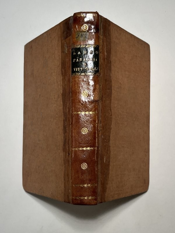 Legatura coeva in mezzapelle avana e cartoncino arancione, dorso con titolo e autore in oro su tassello verde, filetti e piccoli fregi agli scomparti in oro. I tomo ( edizione di Giambattista Bodoni): antiporta inciso su rame a piena pagina, fuori testo, raffigurante il ritratto dell'autore Ubertino Lando firmato Domenico Cagnoni; (16)-84 pagine numerate; frontespizio con marca tipografica. II tomo: (2)-48 pagine numerate, frontespizio con fregio tipografica, testatine e finalini silografati; seconda edizione di quest'opera scritta a Bologna nel 1762 da Agostino Paradisi appena ventiseienne. III tomo: XV-(1b)-159-(1b) pagine numerate. Testo poetico suddiviso in: Sonetti, Idillii, Odi, Canzonette, Anacreontiche, I maccheroni (poemetto giocoso), Endecasillabo del Co. Abate Roberti, Epistola del cavaliere Ippolito Pindemonte. Alcune delle liriche del Vittorelli ebbero grande seguito, tanto da venire messe in musica da musicisti del calibro di Franz Schubert, Vincenzo Bellini, e Giuseppe Verdi. Esemplare in buone condizioni, salvo qualche segno di usura al dorso della legatura, evidenti macchie alle prime carte del terzo testo "Rime", i primi due volumi molto freschi all'interno, in particolare il primo tomo bodoniano.