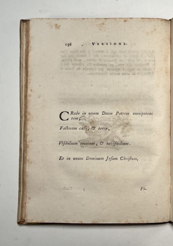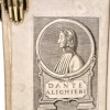 Legatura in piena pergamena, dorso con titolo manoscritto. 203-(3) pagine numerate. Frontespizio con fregio silografato, testatine e finalini silografati, tagli spruzzati di rosso; una bella tavola incisa, fuori testo, con un ritratto di profilo di Dante Alighieri che nell'esemplare in esame è stata postposta dopo la pagina 8; seconda incisione a piena pagina, a pag. 12, con un angelo che sorregge una tavola con la vita di Dante; altra tavola incisa nel testo, a pag. 190, firmata G.P.Zanotti. raffigurante un'acquila recante un vessillo con la scritta "Carmina selecta". Si tratta dell'opera Dantesca tradotta in volgare (e con l'aggiunta di note a piè di pagina) da Francesco Saverio Quadrio, presbitero, scrittore e storico valtellinese. Ristampa dell'edizione 1752, con l'aggiunta di tre canzoni e un sonetto di Dante, che non si trovano nell' edizione precedente. Esemplare in discrete condizioni conservative, lievi arrosature ad alcune carte lungo il testo.