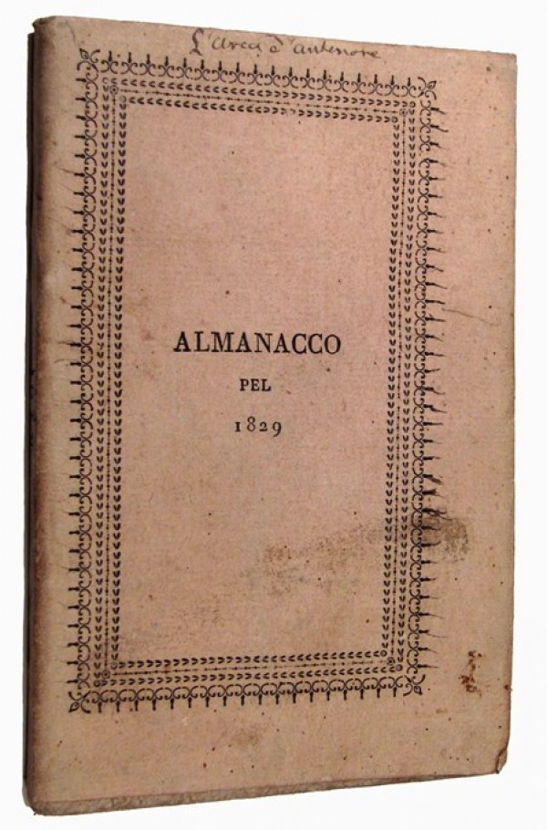 Legatura editoriale in cartoncino rosa con titolo Almanacco 1828 all'interno di cornice tipografica al piatto anteriore (dicitura L'arca di Antenore, manoscritta al bordo superiore) e fregio entro la stessa cornice a quello posteriore. Bella antiporta figurata raffigurante la Fama in volo con la tromba; 79 pagine numerate, compresi il frontespizio, Discorso generale, dedica al Bel Sesso; dopo aver descritto fino a pagina 69 il calendario astrologico dell'anno e il calendario ebraico, l'autore dedica le ultime pagine a XII gustose ricette gastronomiche internazionali, compresa una sull'immancabile anguilla nostrana. Raro e curioso. Esemplare in buone condizioni.