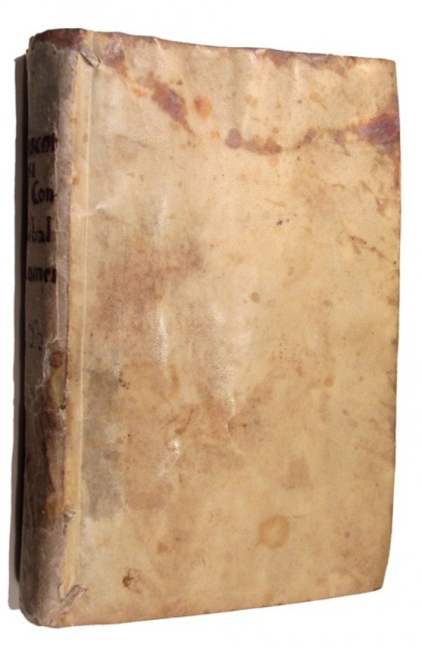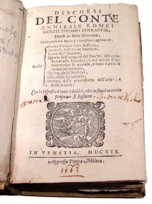 Legatura originale in piena pergamena ; al dorso, titolo manoscritto su tassello di carta. 16 pagine numerate, compreso frontespizio con titolo e marca tipografica, annotazioni a penna; 406 pagine numerate; 2 carte bianche fittamente manoscritte da antiche mani diverse. Testo in lingua volgare e carattere prevalentemente corsivo; capilettera decorati a racemi impressi a silografia. L'opera è un trattato composto da una serie di dialoghi (sul modello del Libro del Cortegiano di B. Castiglione); la prima edizione del testo, articolato in sole 5 giornate, venne impressa a Venezia, per i tipi di Francesco Ziletti, nel 1585. Il volume ebbe un notevole successo, come attestano le sue reimpressioni e le traduzioni in francese e inglese. Particolarmente raffinata è l'ambientazione, perché gli interlocutori sono dame e cavalieri della corte di Alfonso d'Este duca di Ferrara. Ciascuna delle sette giornate dei Discorsi è dedicata a un particolare aspetto della vita e dalla cultura aristocratiche: la bellezza, l'amore umano, l'onore, l' "iniquità del Duello", la nobiltà, le ricchezze e infine la "precedenza dell'Arme, e delle Lettere". Esemplare in buono stato conservativo, numerosi segni a margine eseguiti a penna, piccolo foro di tarlo più evidente alla carta bianca di guardia, al frontespizio e, meno, alla carta successiva.