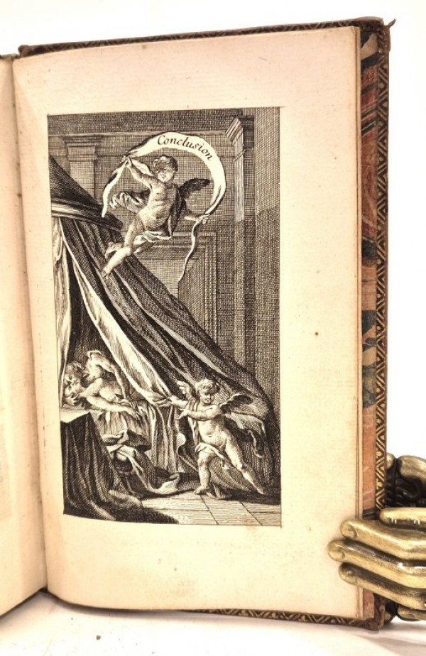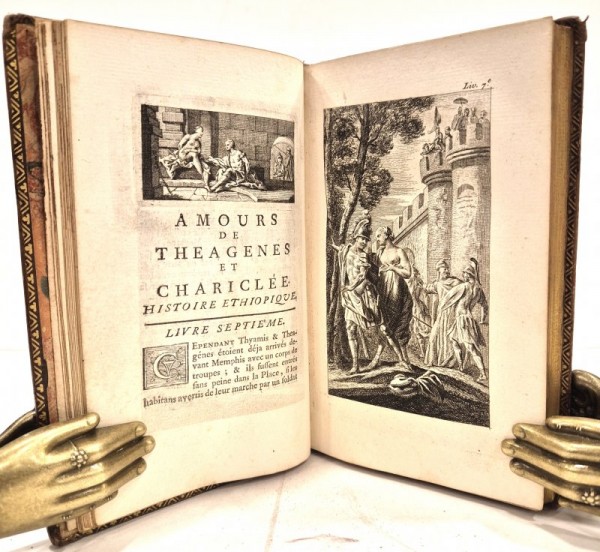 Legatura coeva in piena pelle marrone, triplice filetto in oro ai piatti; dorso con fitta decorazione in oro, titolo e numero di tomo in oro su tassello scuro; dentelle in oro e sguardie marmorizzate; tagli in oro. I volume: frontespizio figurato e inciso; X pagine numerate, compreso il frontespizio con titolo in rosso e nero; 213- (3) pagine numerate; all'interno, 5 tavole incise a piena pagina fuori testo e 5 piccole incisioni in testa alla pagina a fronte delle incisioni. II volume: frontespizio con titolo in rosso e nero; 190 pagine numerate; all'interno 6 incisioni a piena pagina fuori testo (completo della sesta, spesso mancante) e 5 testatine incise in testa alle pagine a fronte delle prime 5 incisioni; capilettera silografati. Edizione illustrata dell'opera dello storico greco Eliodoro di Emesa tradotta in francese e pubblicata la prima volta nel 1729 dall'abate Desfontaine. La Storia d'Etiopia è ritenuta una fra le opere più celebri della cultura classica greca. L'opera è all'origine del romanzo d'avventura; la trama è semplice: due amanti costantemente separati dalle vicissitudini dell'esistenza; Il libro accumula i colpi del destino e darà vita a una letteratura copiosa, soprattutto nel XVIII secolo. Esemplare in buono stato conservativo, fresco e ben inciso.