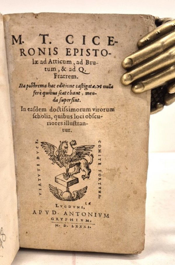 Legatura coeva in piena pergamena rigida con unghie; tracce di lacci deperiti ai piatti; dorso a due nervi in rilievo; antica scritta a penna al taglio superiore. 803-(121) pagine numerate con alcuni errori di numerazione. Frontespizio con marca tipografica silografata con il tipico grifone. Capolettera silografati. Il bel volumetto contiene una raccolta di lettere ciceroniane. Esemplare in discreto stato di conservazione, lieve quanto uniforme ingiallimento delle carte; frontespizio con incollatura di qualche millimetro del margine interno alla carta precedente.