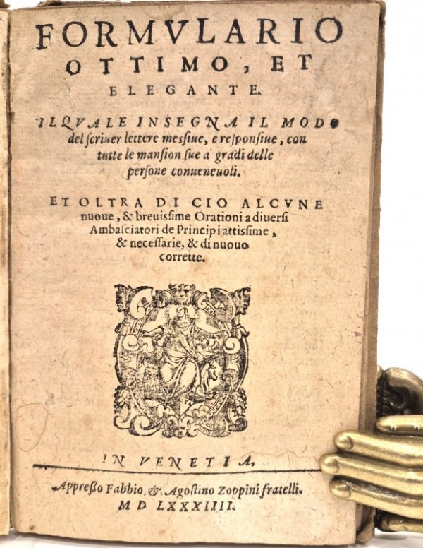 -FORMULARIO OTTIMO, ET ELEGANTE. iL QUALE INSEGNA IL MODO DEL SCRIVER LETTERE MESSIVE, E RESPONSIVE, CON TUTTE LE MANSION SUE A GRADI DELLE PERSONE CONVENEVOLI. ET OLTRA DI CIO ALCUNE NUOVE, & BREVISSIME ORATIONI A DIVERSI AMBASCIATORI DE PRINCIPI ATTISSIME, & NECESSARIE, DINUOVO CORRETTE.