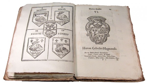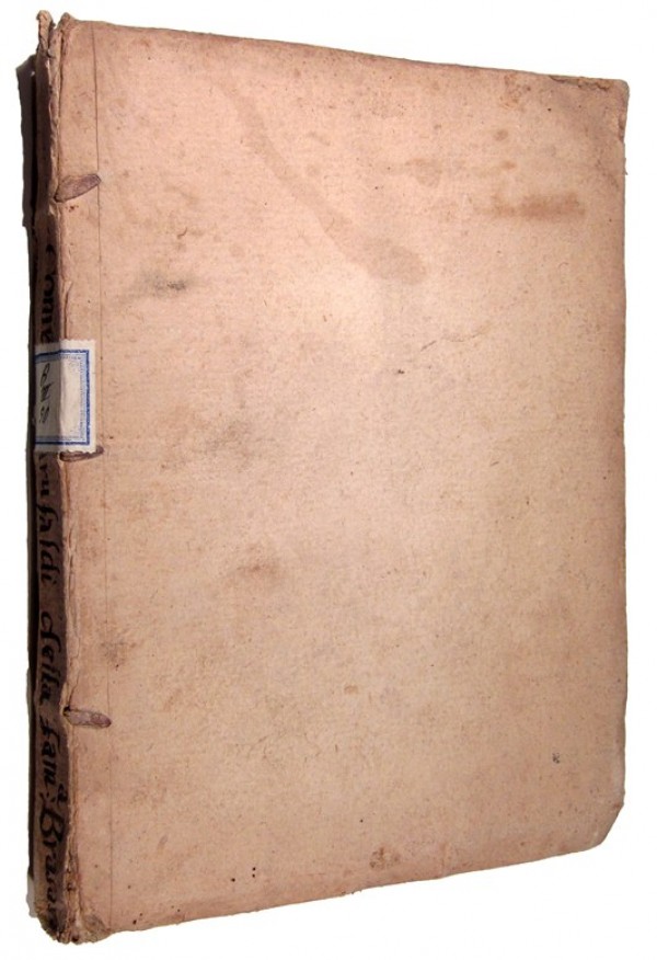 Legatura originale in cartonnage con punte di pelle allumata, titolo manoscritto al dorso e etichetta con numero di collocazione . Occhiello, frontespizio con titolo e marca tipografica silografata, 12 pagine non numerate per dedica con stemma silografato, lettera ai lettori e dati tipografici; 264 pagine numerate per il testo, all'interno del quale alcuni stemmi araldici e fregi ornamentali silografati; mancanza del foglio di guardia posteriore. A pagina 30, una carta fuori testo e ripiegata per albero genealogico della famiglia Brasavola Da pagina 235, autori, notai, indici e aggiunte. L'opera è divisa in otto capitoli: "I°) Dell'Origine dello Studio pubblico di Ferrara, e dell'erezione di questa iscrizione. II°) Dell'Origine, e discendenza della Famiglia Brasavoli. III°) Genealogia autentica della famiglia. IV°) Divisione de' due Rami de' Brasavoli. V°) Discorso dell'Arme di detta Famiglia. VI°) Comento all'Iscrizione d'Antonio Musa per Paragrafi. VII°) Uomini illustri di questa Casa in lettere. VIII°) Uomini illustri in Arme. ". Esemplare in discrete condizioni, ossidazioni alle prime carte, lieve gora al margine superiore da metà libro, altrimenti in buone condizioni, in barbe.
