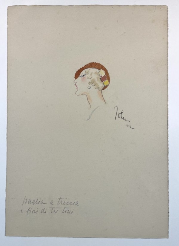 Original watercolor on cardboard representing fashion model, author's signature and date in pencil at the bottom right. The work is up to help John, an American mother Italian dress designer, active mainly in the fashion scene in Turin in the first half of the twentieth century. Its tables are made with mixed media, pencil, watercolor and tempera, characterized by an extremely elegant and sinuous lines that makes it a very 'vintage costume and fashion. Exemplary conservative in good condition.