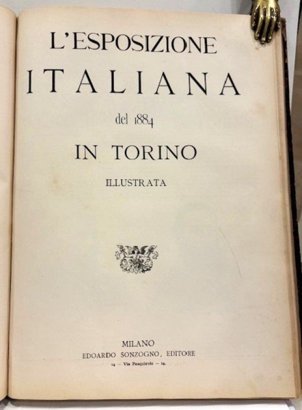 Legatura coeva in mezza pelle e carta decorata; al dorso, titoli e date riassuntivi in oro e fregi orizzontali in oro. Primo volume: 322-(2) pagine numerate con all'interno numerosissime illustrazioni a silografia di testa. Secondo volume: 362-(2) pagine numerate con all'interno  numerosissime illustrazioni a silografia di testa. Due testi riuniti e riguardanti le Esposizioni di Milano del 1881, la prima dopo l'unità d'Italia, volta ad esaltare le capacità decnologiche dell'Italia del tempo e quella di Torino del 1884, detta anche Esposizione Generale Italiana Artistica e Industriale, che vide la partecipazione di quasi 3 milioni di visitatori con la presentazione di innovazioni quali l'illuminazione elettrica e una rete telefonica, oltre che la costruzione del Borgo Medievale al parco del Valentino.  Esemplare in buone condizioni, lievissimo ingiallimento della carta e qualche spellatura agli angoli di carta dei piatti; alle ultime due carte bianche traforatura di tarlo, appena visibile alla pagina precedente e ultima del testo.