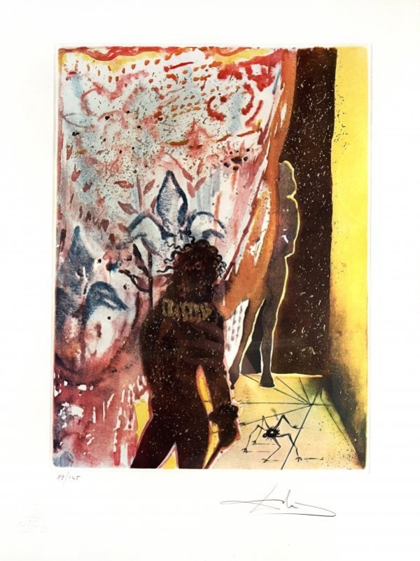 Incisione originale eseguita all'acquaforte e acquatinta su carta Arches, colorata a mano e con rilievi; timbro a secco dell'editore all'angolo inferiore sinistro. Numerazione e firma a matita dell'autore al bordo inferiore. Tiratura n. 39 dei 145 esemplari previsti. L'opera è accompagnata da un "certificat d'authenticité" dell' Editons d'Art Les Heures. Dalì ha reso omaggio a Shakespeare in molte altre opere, ma questa suite è considerata la sua più impressionante. Salvador Dalì fu spesso autore delle iconografie che accompagnavano testi impegnati e spesso controversi del ventesimo secolo, egli fu uno degli artisti più liberi da questo punto di vista e la sua indipendenza dai vincoli morali fu sempre notata sia in senso positivo sia in senso negativo. Esemplare in perfetto stato conservativo, margini intatti.