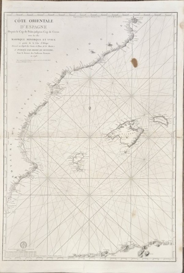 COTE ORIENTALE D'ESPAGNE DEPUIS LE CAP DE PALOS JUSQ'AU CAP DE CREUX AVEC LES ILES MAIORQUE MINORQUE ET YVICE ET PARTIE DE LA COTE D'AFRIQUE DRESSÉE PAR ORDRE DU MINISTRE, POUR LE SERVICE DES VAISSEAUX FRANCAIS EN 1793
