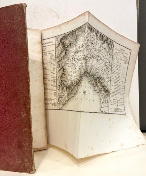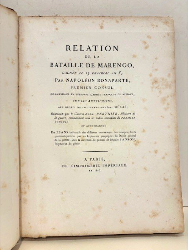 Legatura coeva in cartone spugnato di colore rosa scuro con sciupature e mancanze al dorso. 1 carta bianca; 1 carta non numerata per l'occhiello; un'incisione fuori testo eseguita da Paquet su disegno di Vernet, raffigurante Napoleone a cavallo mentre conversa con Berthier prima della battaglia; 4 pagine non numerate per frontespizio e dedicatoria; 1 tavola sinottica ripiegata con testo "Situation de l'Armée de Réserve"; 40 pagine numerate; 2 pagine non numerate per Errata; seguono 6 tavole incise e ripiegate fuori testo: la prima è 1 carta generale della campagna napoleonica in Italia; 4 carte topografiche di Alessandria e territorio circostante; 1 bella veduta di Marengo, ideata da Bagetti, ripresa durante la vittoria dei francesi. Fedele racconto della battaglia di Marengo (14 giugno 1800) redatto da uno dei suoi principali protagonisti, il pluridecorato generale Alexandre Berthier, ministro della guerra durante il Consolato e capo di Stato Maggiore di Napoleone. Durante la battaglia di Marengo gli fu affidato il comando dell’esercito di riserva. Esemplare completo di questa seconda edizione figurata, la prima nel 1805. Segnali difetti al dorso delola legatura e sporadiche macchie di foxing.
