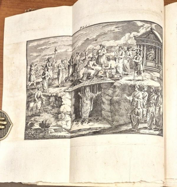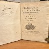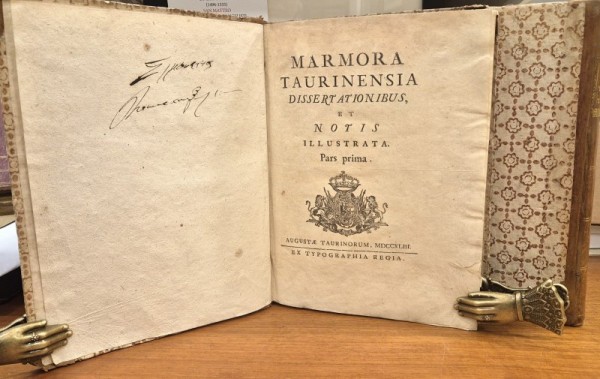 Legatura in mezza pelle e carta decorata. Titolo e numero di tomo al dorso con filettature dorate. Stemmi sabaudi ai frontespizi, capilettera abitati, testatine e finalini silografati. I volume: firma manoscritta per antica mano all'antiporta; sopra la dedicatoria, ritratto di Carlo Emanuele Re di Sardegna iscritto in vignetta tonda; (32 -280 pagine - 23 tavole, incise su rame, fuori testo, alcune ripiegate (Fran. A. Gilodi Scu. Taurini; C. Brun S. Taurini; Vittorio Labranche sculp.) II volume, (12) - 144 pagine - 34 tavole, incise su rame fuori testo (F. A. Mayesle del., Io. Cattini fecit). Opera classica di archeologia ed epigrafia torinesi, scritta in latino in due volumi del XVIII secolo (1743). Pubblicata a Torino, raccoglie e illustra iscrizioni latine e reperti archeologici di Torino (Augusta Taurinorum) e del Piemonte ed è arricchita da incisioni e stemmi sabaudi. Esemplare in discrete condizioni conservative, "in barbe", diffuse tracce di foxing in alcuni fogli del I volume.